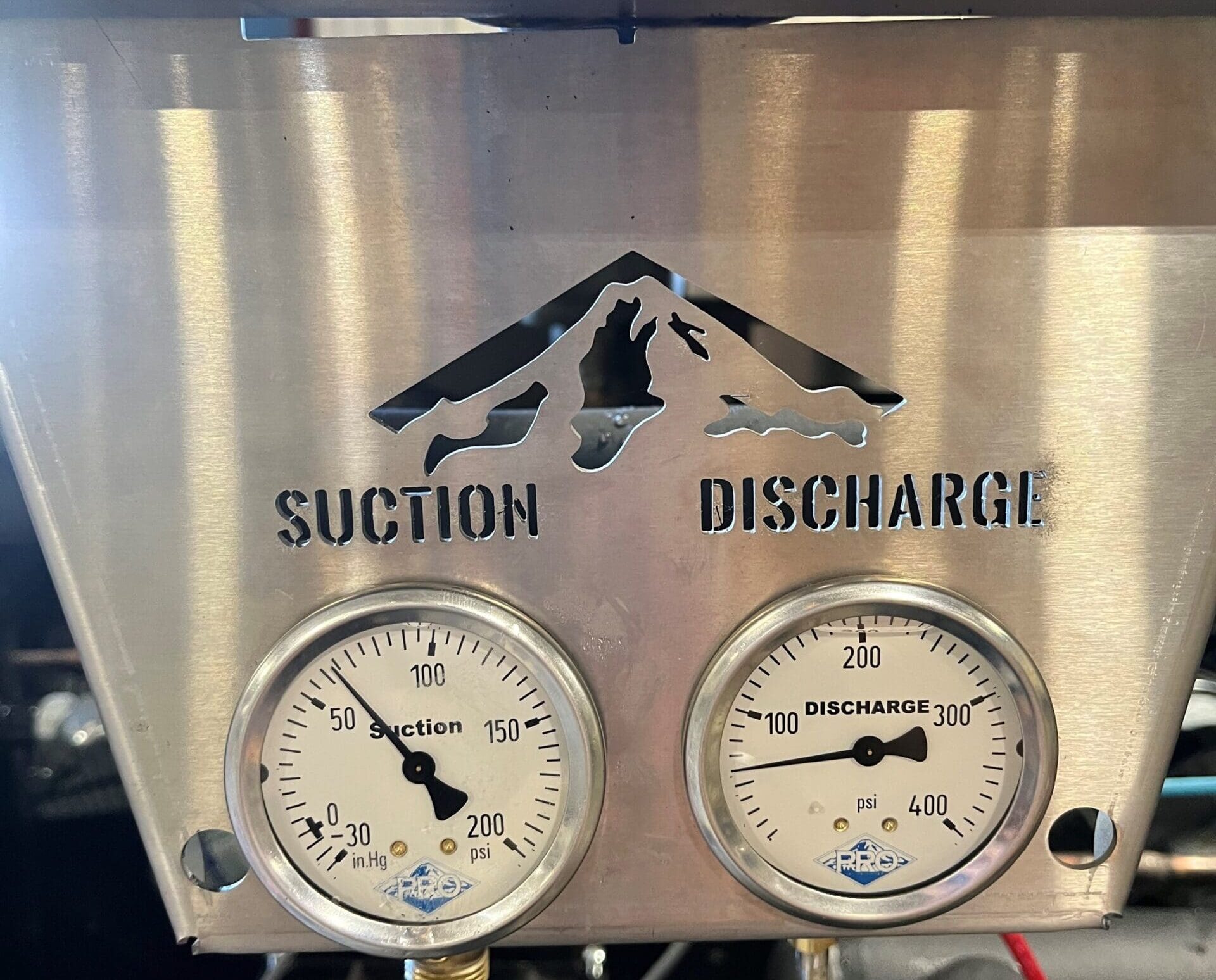 Laser cut bracket from 10 gauge galvanized steel supplied with PRO’s standard liquid filled High and Low Pressure Gauges and isolation valves with transducer port.  This is a great assembly for the service truck, easy to add to any chiller System or install as a direct replacement.
